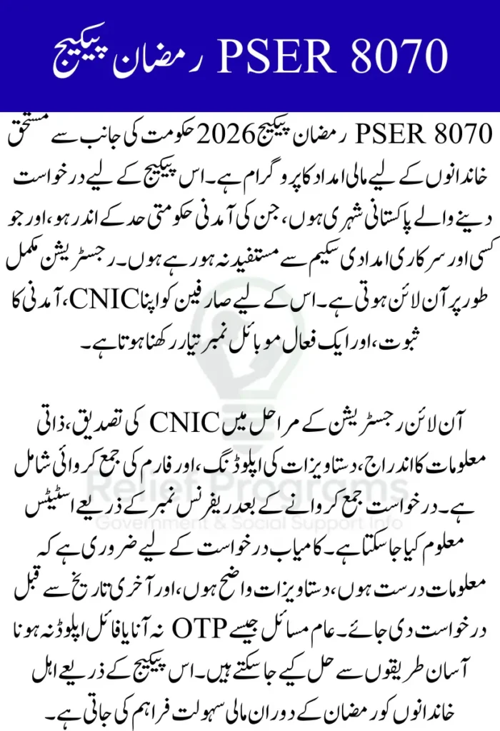 The 8070 PSER Ramzan Package 2026 is a government initiative designed to provide financial support to eligible families during the holy month of Ramzan. This article explains how to register for the package online, what documents are required, and how to track your application. By following this step-by-step guide, you can ensure your application is submitted correctly, increasing the chances of receiving timely assistance.