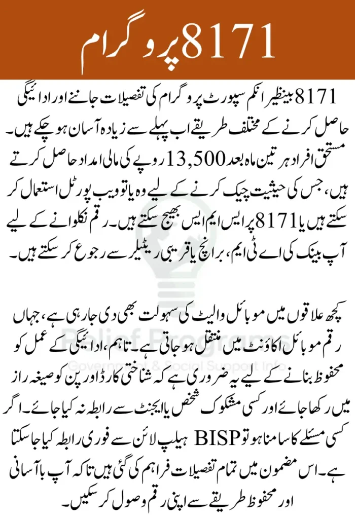 8171 بینظیر انکم سپورٹ پروگرام ایک اہم حکومتی اقدام ہے جو مستحق خاندانوں کو مالی امداد فراہم کرتا ہے۔ اگر آپ اس پروگرام کے تحت رجسٹرڈ ہیں، تو آپ 8171 پر اپنا شناختی کارڈ نمبر بھیج کر آسانی سے اپنی ادائیگی کی معلومات حاصل کر سکتے ہیں۔ اس کے لیے صرف ایک موبائل فون کی ضرورت ہے۔