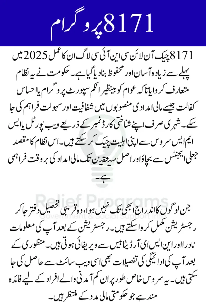 If you don’t have access to the internet, you can still check your status. Just send your CNIC number (without dashes) via SMS to 8171. You’ll receive a response within a few minutes with your eligibility result.