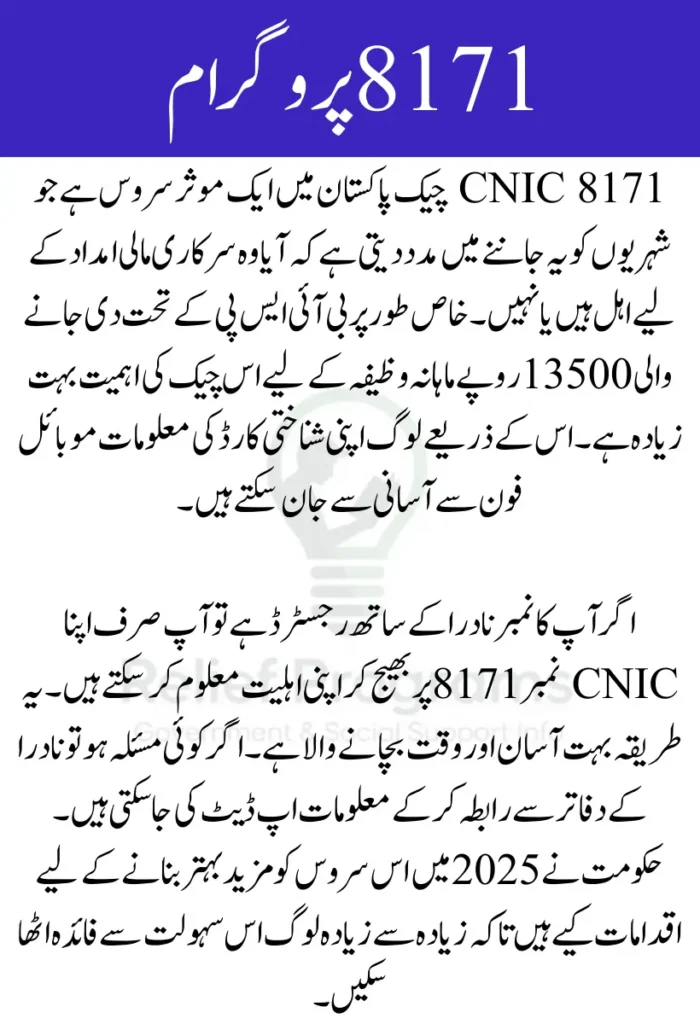 پاکستان میں 8171 CNIC چیک ایک آسان طریقہ ہے جس کے ذریعے شہری اپنی شناختی کارڈ کی حیثیت جان سکتے ہیں کہ آیا وہ سرکاری امداد کے لیے اہل ہیں یا نہیں۔ یہ سروس موبائل فون سے SMS بھیج کر کی جاتی ہے جو بہت جلد جواب دیتی ہے۔ خاص طور پر بی آئی ایس پی پروگرام میں اس چیک کی اہمیت زیادہ ہے تاکہ مستحق افراد بروقت مالی مدد حاصل کر سکیں۔
