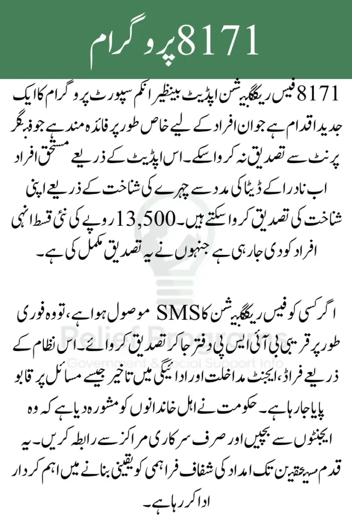 8171 فیس ریکگنیشن اپڈیٹ بینظیر انکم سپورٹ پروگرام میں ایک انقلابی قدم ہے۔ اس جدید ٹیکنالوجی کے ذریعے اب وہ افراد بھی قسط حاصل کر سکیں گے جن کے انگوٹھوں کے نشان خراب یا نا قابل شناخت تھے۔ اس سسٹم کا مقصد زیادہ شفافیت اور فراڈ سے پاک ادائیگی کا عمل یقینی بنانا ہے۔