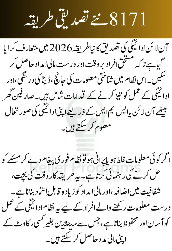 The updated verification method for the 8171 Online Payment Check emphasizes matching CNIC and household information with official databases. By cross-checking identity records digitally, the system prevents duplicate entries and incorrect payments. Users now receive clear messages regarding their payment status, such as approved, pending, or blocked due to verification issues. This ensures transparency and faster processing for all applicants.