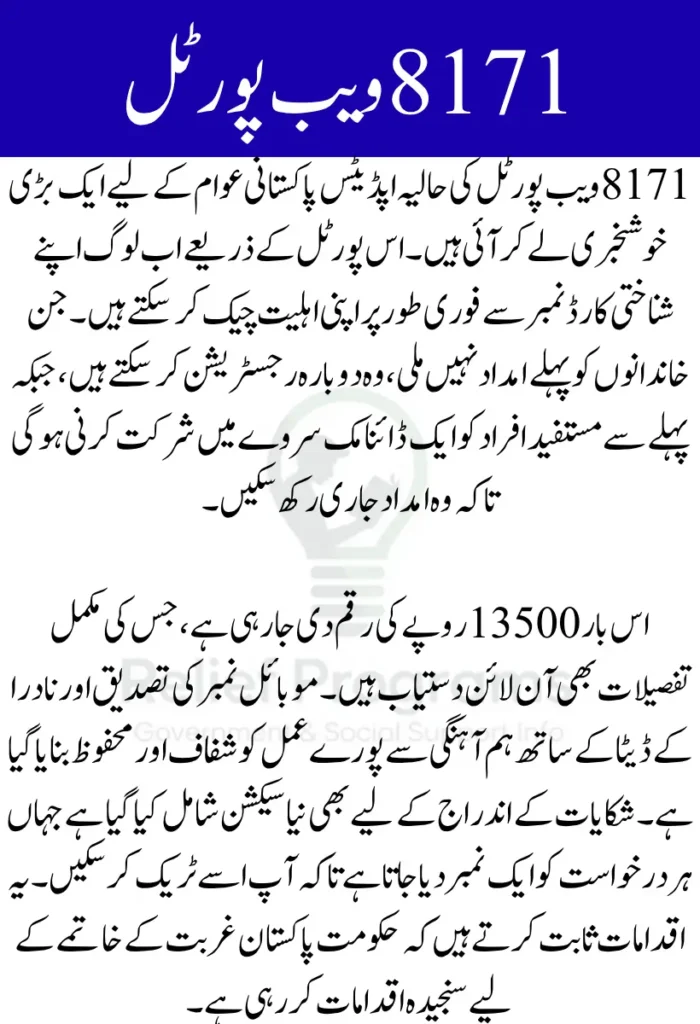 8171 ویب پورٹل کو حکومت پاکستان نے مزید بہتر بنا دیا ہے تاکہ مستحق افراد کو امداد کی فراہمی میں کوئی رکاوٹ نہ آئے۔ اب ہر شخص اپنے شناختی کارڈ کے ذریعے آن لائن اپنی اہلیت چیک کر سکتا ہے اور جان سکتا ہے کہ وہ 13500 روپے کی امداد کے لیے اہل ہے یا نہیں۔