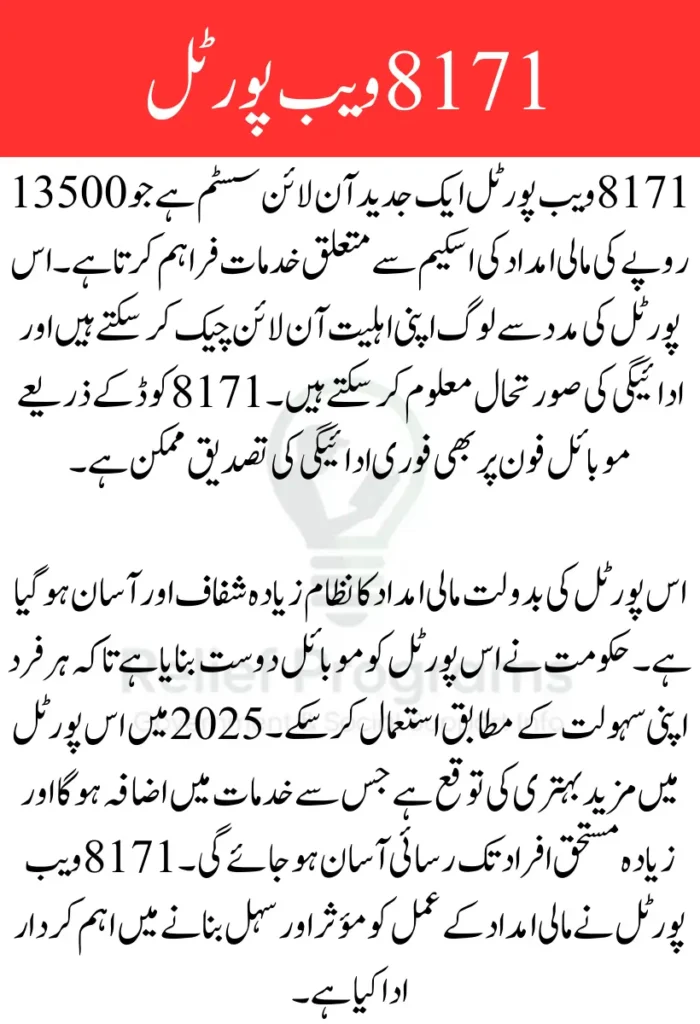 8171 ویب پورٹل ایک اہم آن لائن ذریعہ ہے جو 13500 مالی امداد کے پروگرام کے بارے میں معلومات فراہم کرتا ہے۔ اس پورٹل کے ذریعے صارفین اپنی اہلیت چیک کر سکتے ہیں اور ادائیگی کی تفصیلات حاصل کر سکتے ہیں۔ 8171 کوڈ کے ذریعے موبائل فون سے بھی ادائیگی کی تصدیق ممکن ہے، جس سے سہولت میں اضافہ ہوتا ہے۔