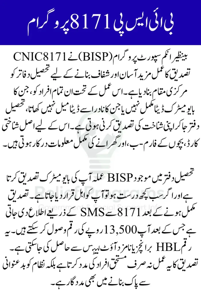 Once your BISP 8171 CNIC Verification is completed successfully, your status is marked “eligible,” and you will receive an SMS confirmation. Afterward, the Rs. 13,500 payment can be received from designated HBL branches or payment centers.
