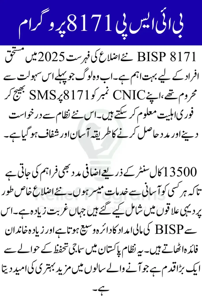 BISP 8171 نئے اضلاع کی فہرست 2025 میں شامل کی گئی ہے تاکہ مزید مستحق افراد کو مالی مدد فراہم کی جا سکے۔ SMS کے ذریعے CNIC نمبر 8171 پر بھیج کر فوری اہلیت معلوم کی جا سکتی ہے۔ یہ سہولت خاص طور پر ان علاقوں کے لیے بہت مددگار ہے جہاں انٹرنیٹ یا بینکنگ سہولیات کم دستیاب ہیں۔