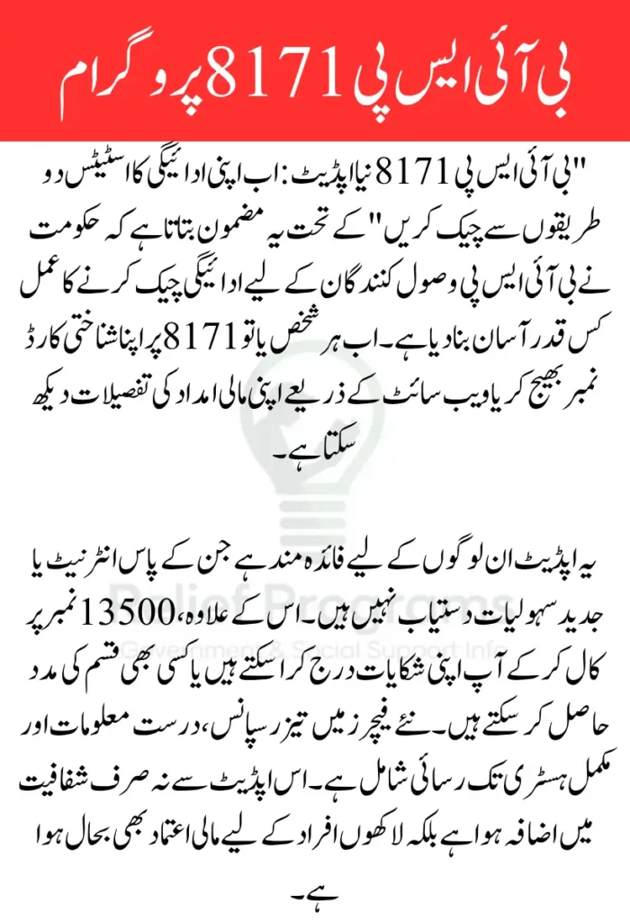 بی آئی ایس پی 8171 کے نئے اپڈیٹ نے مستحق افراد کے لیے ادائیگی کی معلومات حاصل کرنا بہت آسان بنا دیا ہے۔ اب صرف ایک ایس ایم ایس یا ویب پورٹل کے ذریعے آپ جان سکتے ہیں کہ آپ کا پیسہ آیا ہے یا نہیں۔ یہ سہولت ان لوگوں کے لیے بہت مددگار ہے جو دور دراز علاقوں میں رہتے ہیں یا انٹرنیٹ سے محروم ہیں۔