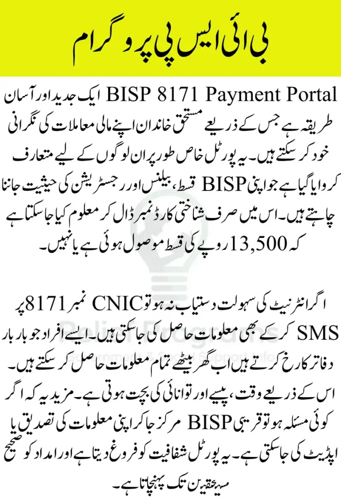 بینظیر انکم سپورٹ پروگرام حکومت کی جانب سے کم آمدنی والے خاندانوں کو مالی مدد فراہم کرنے کا ایک اہم منصوبہ ہے۔ اب مستحق افراد کے لیے BISP 8171 پورٹل متعارف کروایا گیا ہے جس کے ذریعے وہ گھر بیٹھے اپنی قسط، رجسٹریشن اور بیلنس کی معلومات حاصل کر سکتے ہیں۔ یہ نظام خاص طور پر ان افراد کے لیے فائدہ مند ہے جو دور دراز علاقوں میں رہتے ہیں اور دفاتر کے چکر نہیں لگا سکتے۔