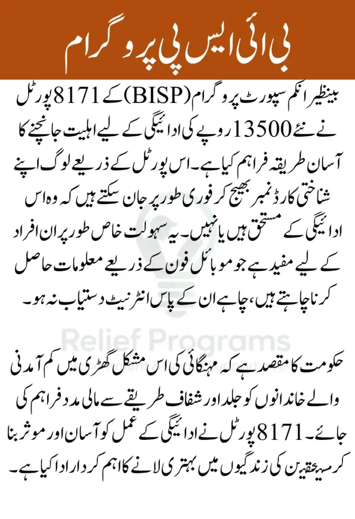 بینظیر انکم سپورٹ پروگرام کا 8171 پورٹل اب نئے 13500 روپے کی ادائیگی کے لیے اہلیت چیک کرنے کی سہولت فراہم کرتا ہے۔ اس پورٹل کی بدولت مستحق افراد اپنے شناختی کارڈ نمبر کے ذریعے آسانی سے اس بات کی تصدیق کر سکتے ہیں کہ آیا وہ اس رقم کے اہل ہیں یا نہیں۔ 8171 پورٹل کا استعمال موبائل کے ذریعے کیا جاتا ہے اور یہ خاص طور پر ان لوگوں کے لیے مفید ہے جن کے پاس انٹرنیٹ نہیں ہوتا۔ اس سہولت نے مالی امداد کا عمل بہت آسان بنا دیا ہے۔