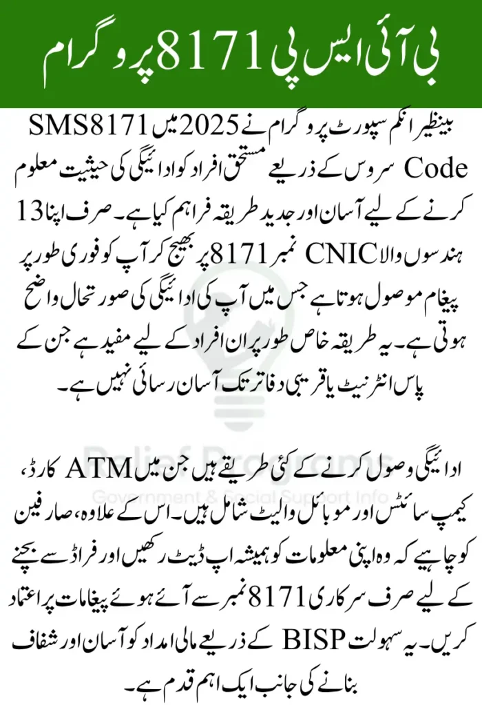 بینظیر انکم سپورٹ پروگرام (BISP) نے 8171 SMS Code سروس 2025 میں متعارف کرائی ہے جس کے ذریعے مستحق افراد آسانی سے اپنے ادائیگی کی حیثیت جان سکتے ہیں۔ آپ کو بس اپنا 13 ہندسوں والا CNIC نمبر 8171 پر پیغام بھیجنا ہے اور چند لمحوں میں جواب حاصل ہو جائے گا۔ یہ سہولت خاص طور پر ان لوگوں کے لیے اہم ہے جو انٹرنیٹ تک رسائی نہیں رکھتے۔