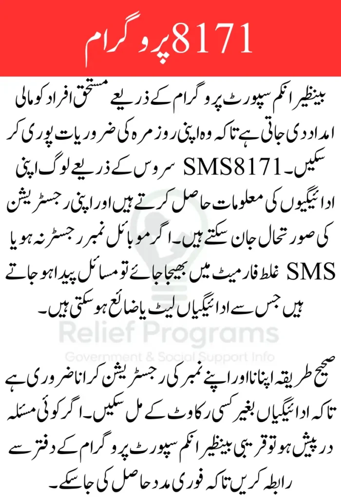 بینظیر انکم سپورٹ پروگرام پاکستان کے غریب اور مستحق خاندانوں کی مالی مدد کے لیے بنایا گیا ہے۔ اس پروگرام کے ذریعے لوگوں کو ماہانہ امداد دی جاتی ہے تاکہ ان کی زندگی بہتر ہو سکے۔ بہت سے لوگ 8171 نمبر کے ذریعے اپنی ادائیگیوں کی معلومات حاصل کرتے ہیں لیکن بعض اوقات انہیں مسائل کا سامنا ہوتا ہے جس کی وجہ سے ادائیگیوں میں تاخیر ہو جاتی ہے۔ اس مسئلے کو سمجھنا اور حل کرنا ضروری ہے تاکہ ہر مستحق فرد آسانی سے اپنی رقم وصول کر سکے۔