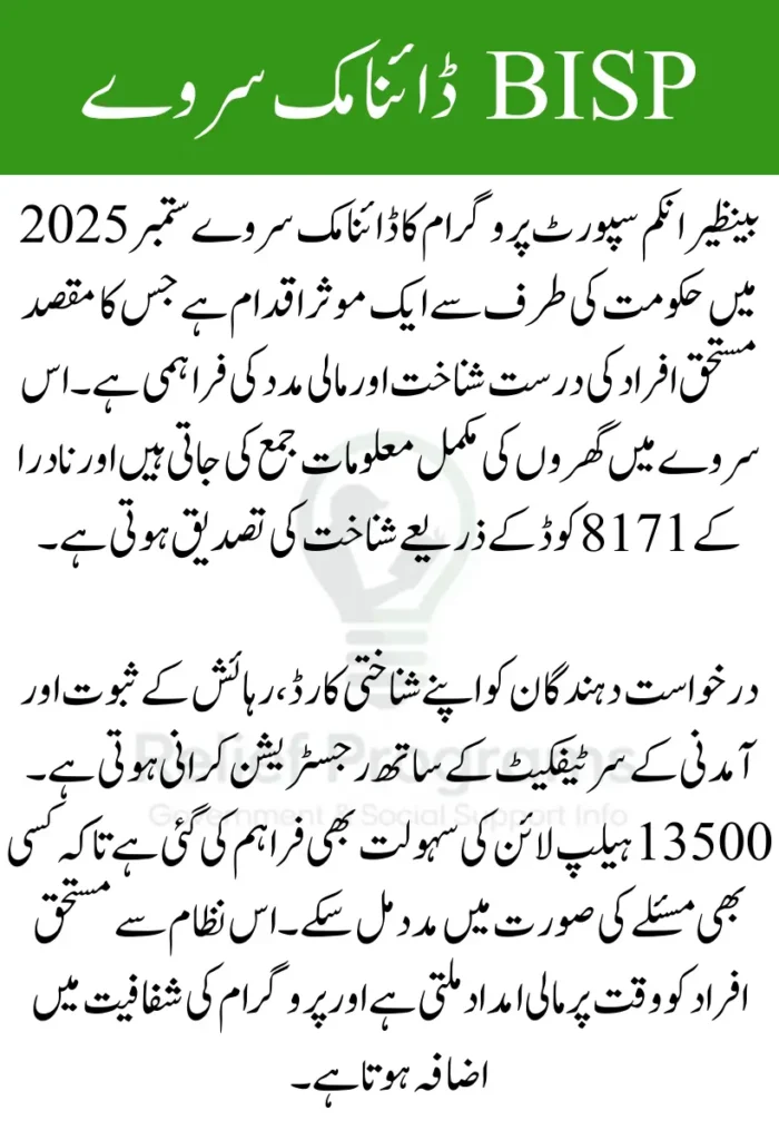 بینظیر انکم سپورٹ پروگرام پاکستان کے غریب اور کمزور خاندانوں کی مدد کے لیے اہم ادارہ ہے۔ ہر سال حکومت مختلف طریقوں سے مستحق افراد کی نشاندہی کرتی ہے تاکہ مالی امداد فراہم کی جا سکے۔ ستمبر 2025 میں بی آئی ایس پی نے ایک نیا سروے شروع کیا ہے جسے ڈائنامک سروے کہتے ہیں۔ اس سروے کا مقصد خاندانوں کی تازہ ترین معلومات اکٹھی کرنا ہے تاکہ صحیح لوگوں کو مالی تعاون ملے۔