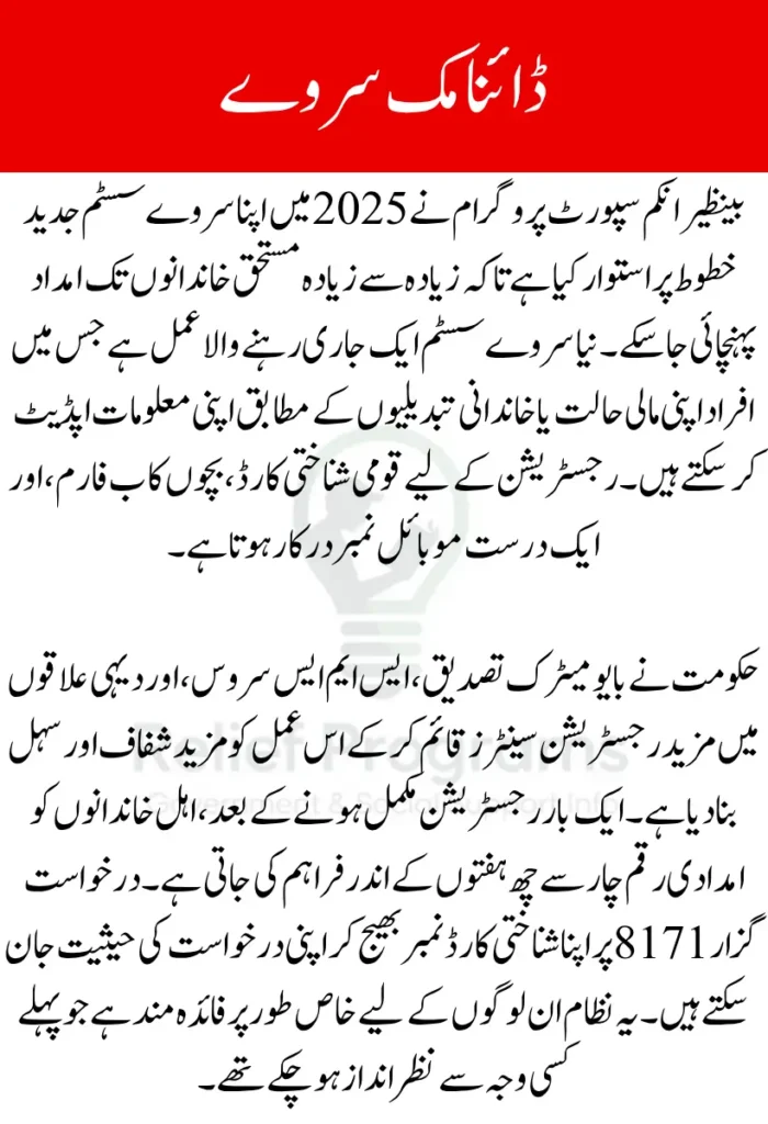 BISP Dynamic Survey Registration is the updated method through which eligible families in Pakistan can apply for financial assistance under the Benazir Income Support Programme. This new system, rolled out with enhancements in October 2025, is designed to be more transparent, efficient, and responsive to changes in a household’s circumstances. It replaces the old, one-time surveys with a continuous, real-time data collection approach that better reflects current economic conditions.