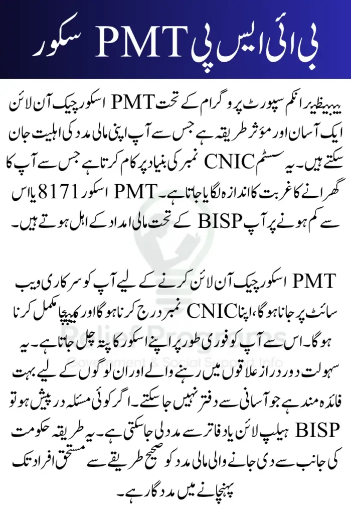 بینیظیر انکم سپورٹ پروگرام پاکستان میں غربت ختم کرنے کے لئے اہم مالی امداد فراہم کرتا ہے۔ اس پروگرام میں شامل ہونے کے لئے PMT اسکور کا آن لائن چیک کرنا ضروری ہے تاکہ حکومت یہ جان سکے کہ کون مستحق ہے۔ PMT اسکور آن لائن چیک کرنے کا طریقہ آسان ہے اور اس کے ذریعے اپنے شناختی کارڈ نمبر کی مدد سے اپنی مالی حالت کا پتہ لگا سکتے ہیں۔
