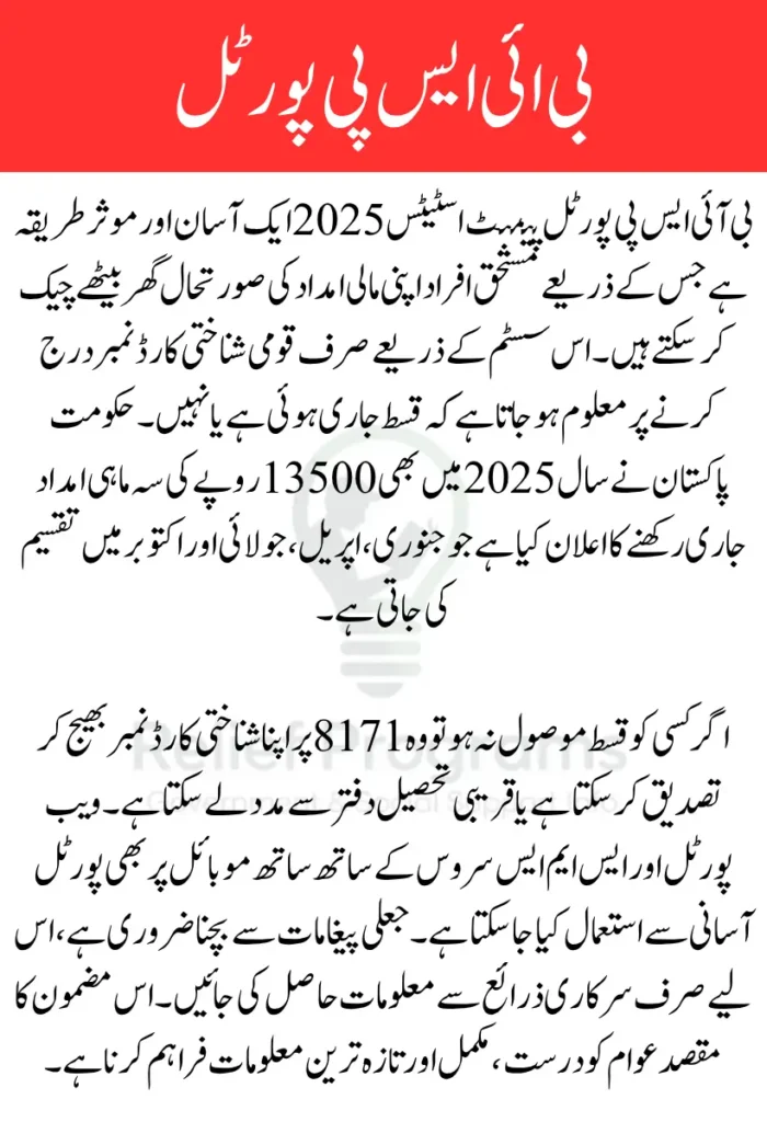 2026 میں حکومت نے فیصلہ کیا ہے کہ بی آئی ایس پی کے مستحق افراد کو ہر تین ماہ بعد 13500 روپے کی مالی امداد دی جائے گی۔ اس رقم کی فراہمی عام طور پر جنوری، اپریل، جولائی اور اکتوبر میں کی جاتی ہے۔ اگر کسی مستحق کو قسط موصول نہیں ہوئی تو وہ 8171 پر ایس ایم ایس بھیج کر یا آن لائن پورٹل پر جا کر اپنا اسٹیٹس چیک کر سکتا ہے۔