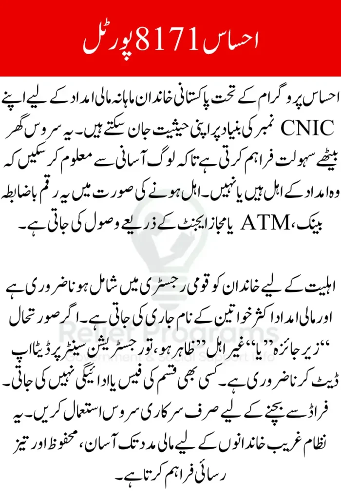 - Only use the official Ehsaas 8171 Validation Portal and the 8171 SMS service.