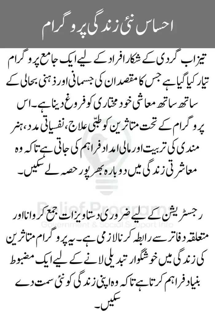 The Ehsaas Nayee Zindagi Program is a vital social welfare initiative designed to support acid attack survivors in Pakistan. This program focuses on providing holistic care, including medical treatment, psychological counseling, vocational training, and financial assistance. By addressing the physical, emotional, and economic challenges faced by survivors, it aims to help them rebuild their lives with dignity and confidence.