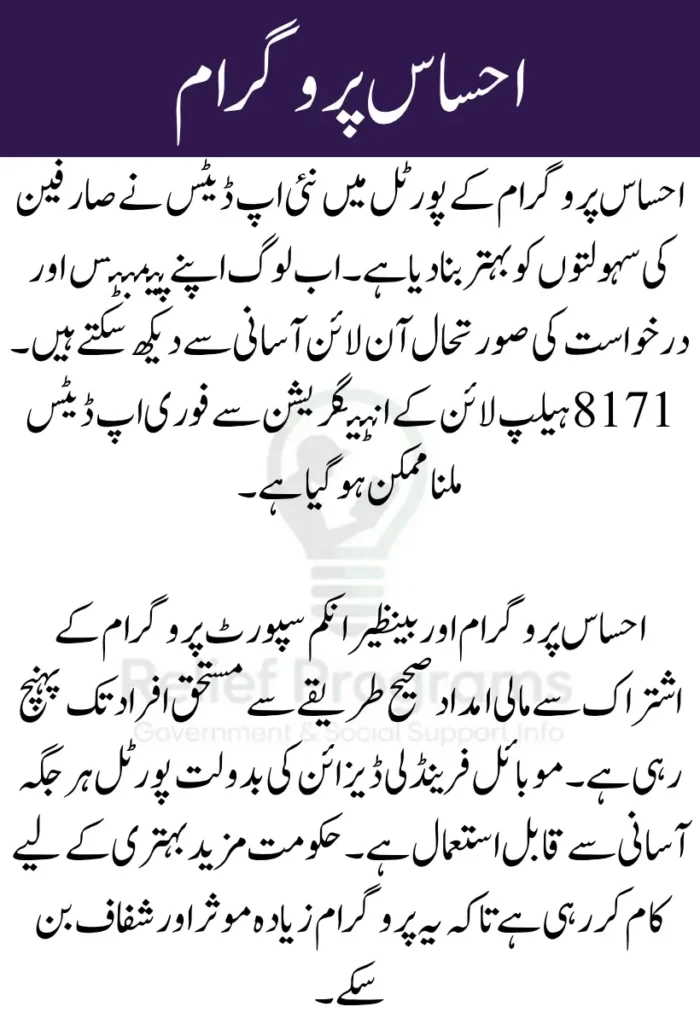 احساس پروگرام کی ویب پورٹل میں نئی تبدیلیوں نے صارفین کے لیے سہولتیں بڑھا دی ہیں۔ اب لوگ گھر بیٹھے اپنے پیمنٹس کی جانچ کر سکتے ہیں اور رجسٹریشن کے عمل کو آسانی سے مکمل کر سکتے ہیں۔ اس سے پروگرام میں شفافیت بڑھی ہے اور عوام کا اعتماد مضبوط ہوا ہے۔
