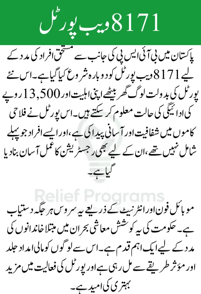 The 8171 Web Portal Relaunched targets families most affected by economic challenges in Pakistan. Eligibility is based on a variety of factors including household income, poverty score, and inclusion in the National Socio-Economic Registry (NSER). The government has expanded the coverage to help those suffering due to inflation, health crises, and unemployment.