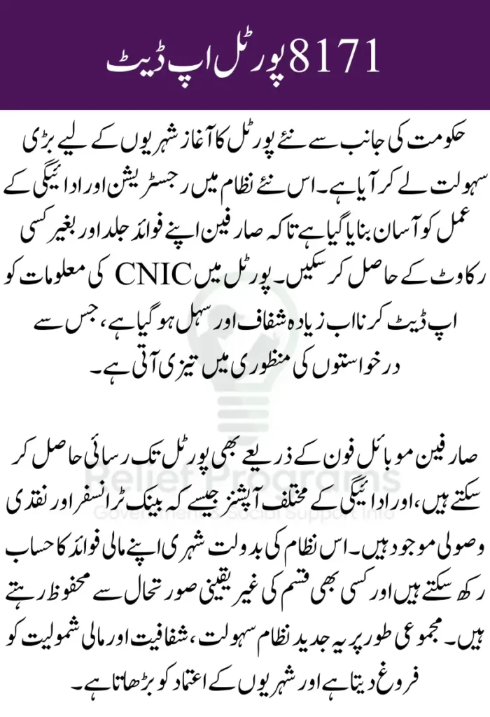 Along with CNIC updates, the 8171 Web Portal Relaunched includes flexible payment methods. Beneficiaries can now receive funds through direct bank transfers, mobile wallets, or designated cash pickup points. This ensures that payments reach citizens in urban and remote areas alike.
