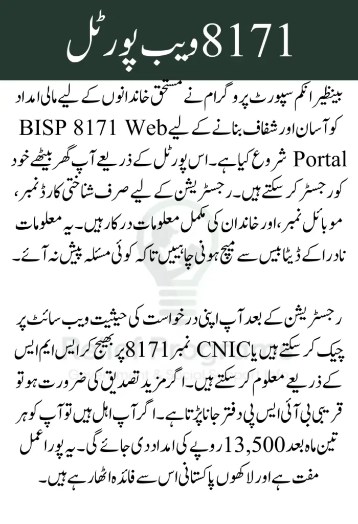 بینظیر انکم سپورٹ پروگرام نے رجسٹریشن کا عمل آسان بنانے کے لیے BISP 8171 ویب پورٹل متعارف کروایا ہے۔ اب آپ گھر بیٹھے صرف اپنا شناختی کارڈ نمبر اور چند ضروری معلومات دے کر رجسٹریشن کر سکتے ہیں۔ یہ پورٹل ان افراد کے لیے ہے جن کی آمدنی کم ہے اور مالی مدد کی ضرورت ہے۔